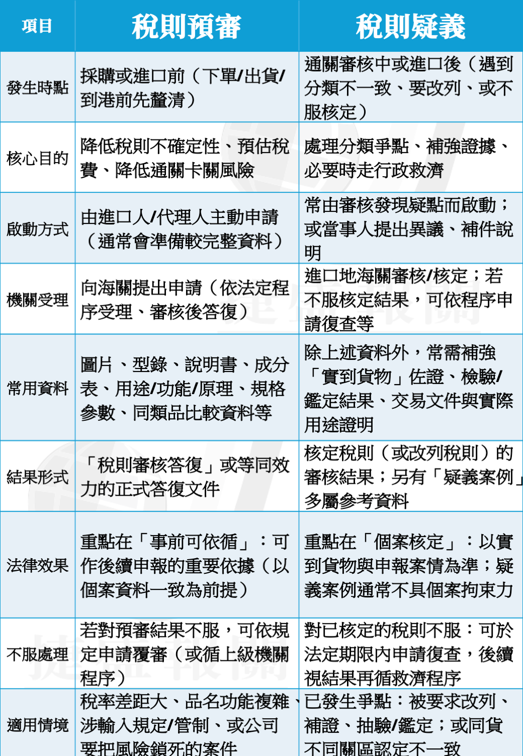 (以「進口前」的預審 vs 「通關中/進口後」的疑義與爭議處理為主)